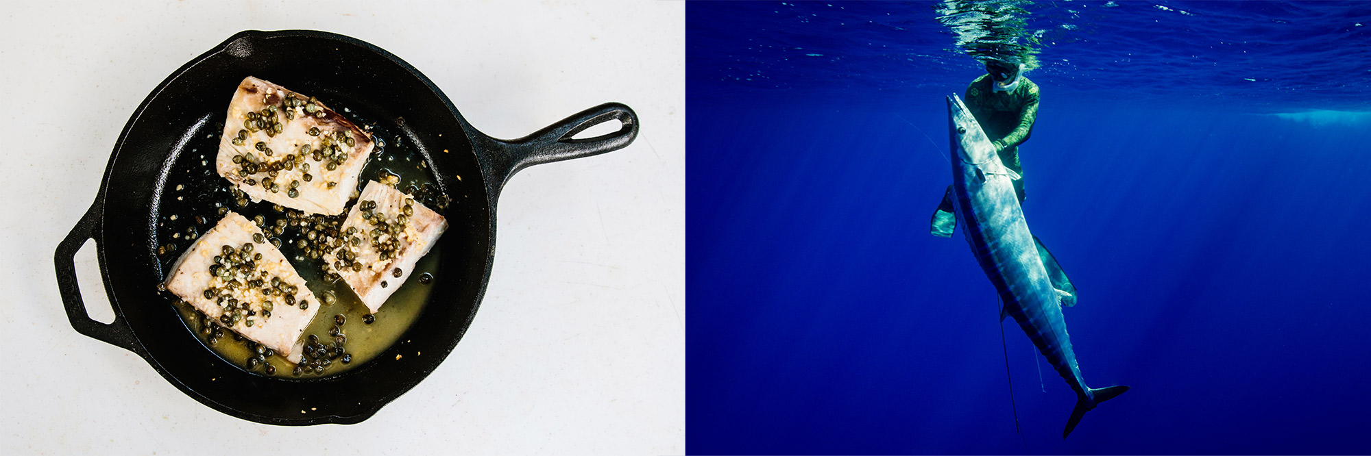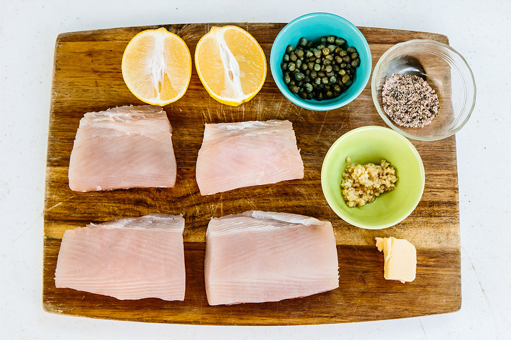 Wahoo (ono) fillets with butter, lemon, caper, garlic sauce