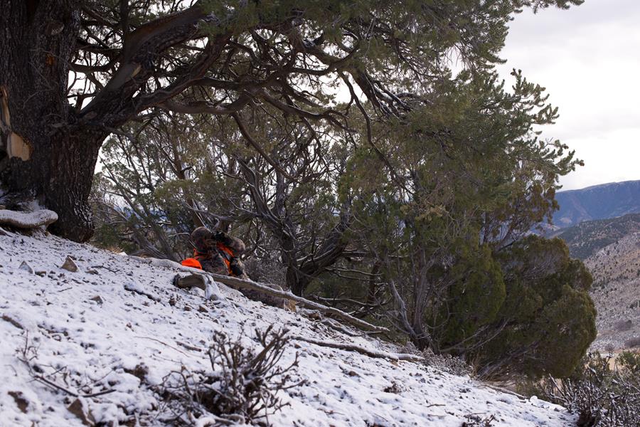 Rich wasn’t feeling well during the hunt, so we all pitched in and split up to cover more ground to find Rich a quality buck to match his standards. After putting on a few miles and turning up nothing, I pushed to a ridgeline and glassed to find a great looking, heavy deer bedded in some timber at the top. I snapped a fuzzy, motion-blurred photo of him through the scope and hustled back to the cabin, where Rich quickly committed to going in after this buck.