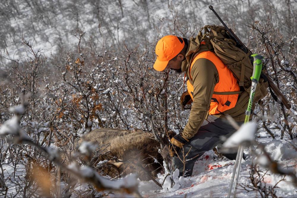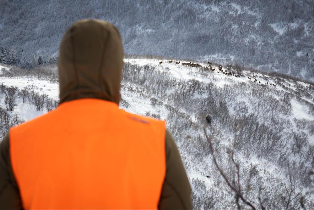 The last 400 ft were the hardest. Waist deep snow and a breakable crust made any sort of dexterous movement impossible. I floundered and crawled, awkwardly using the trekking poles like ice picks, anchors against which I could pull myself a handful of feet at a time. I reached the top of the ridge a few minutes after legal light and Jay pointed out 12 cows on a narrow spine of rock below us. For a brief moment it seemed like the hunt was all but over. The elk were headed towards us and a 150 yd shot was inevitable. The universe had other plans though and affirmed to me that I had not yet earned it. I had not struggled enough for this hunt to be what I needed it to be. The cows picked up speed and angled away, pausing to look at us for an instant before they dropped out of site into another drainage.