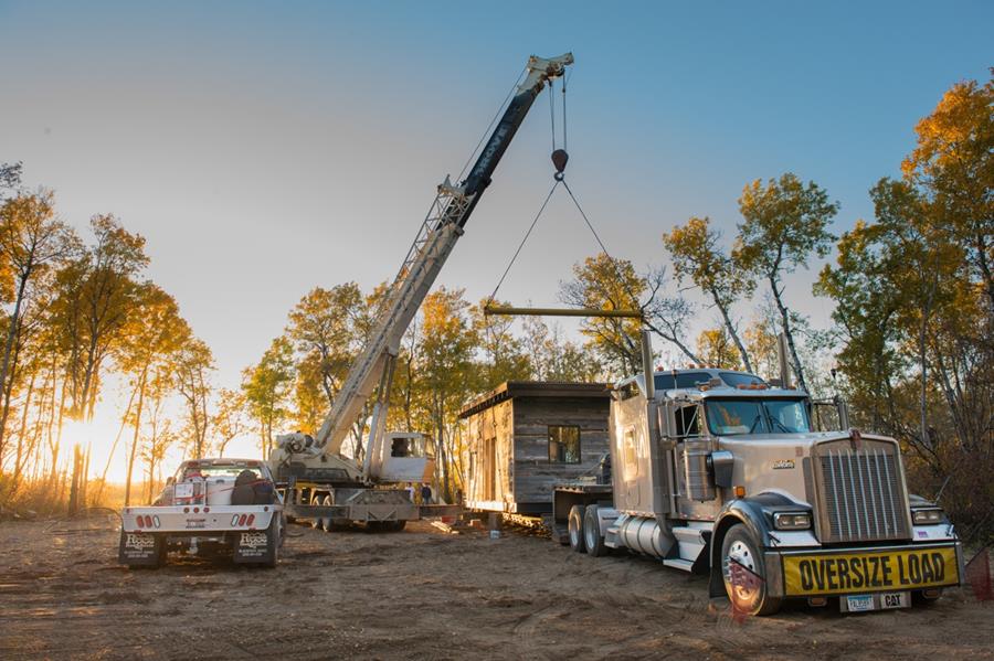 We live in Minnesota so this project took us not only across the US but also through customs and international borders. The camp was built in less than 3 weeks and in 3 pieces in Idaho Falls, Idaho. Three semis then transported our 17'3" tall camp through many off routes for 4 days to their permanent location. Upon arrival the units were unloaded, set on screw piles, blocked, and assembled with a Canadian crew. Three more trailers arrived simultaneously from our home in Minnesota filled with Big Foot decoys, a four wheeler, duck boats, lots of Sitka gear and every household need down to the toilet paper. Five days after we started assembly, beds were made and our first guests arrived. The hunt was on and a new chapter of our family tradition had begun!