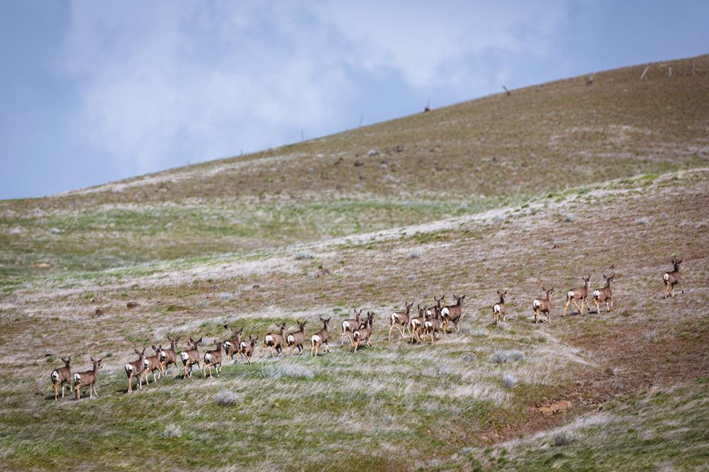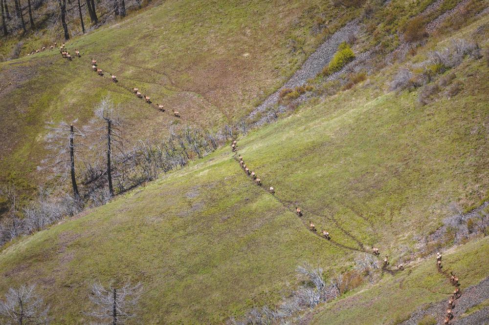 Look at the hard-hooved, stout, muscular body of an elk or mule deer long enough and you can start to understand how they were built to migrate. Deer, elk, moose, bighorn sheep, bison and antelope all require large, connected landscapes to survive in a climate where snow shuts down high mountain habitat in the winter, and heat and dry conditions make lower elevations inhospitable in the summer. Their lives and locations are determined by the survivability of the landscape, and where and when they have the best chances of producing offspring. Season to season, they endure long distances to follow the spring green up and put on fat and produce milk for newborn calves, fawns and lambs after making it through the winter. For some, this can mean hundreds of miles of travel like that of pronghorn - making theirs the longest migration in the western hemisphere second to that of the Arctic caribou. Mule deer can travel hundreds of miles to meet their needs, repeating the same path year after year. They take advantage of high-elevation forage in the summer and retrace their journey back to lower elevations to inhabit winter ranges.