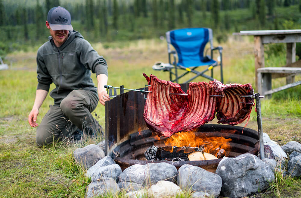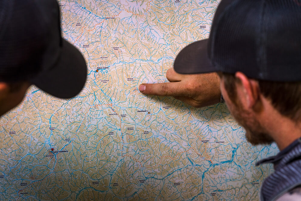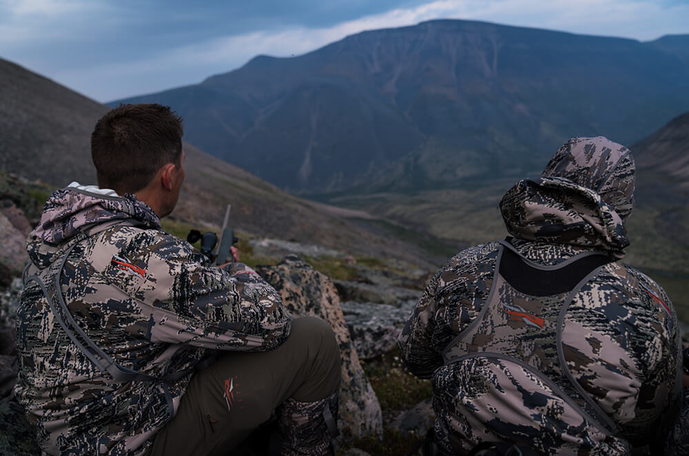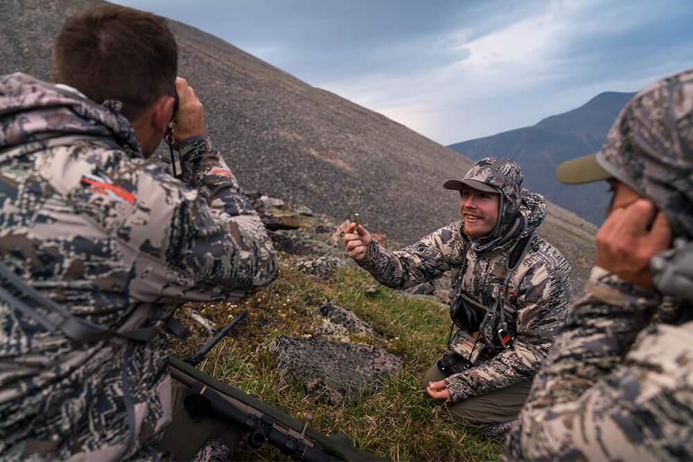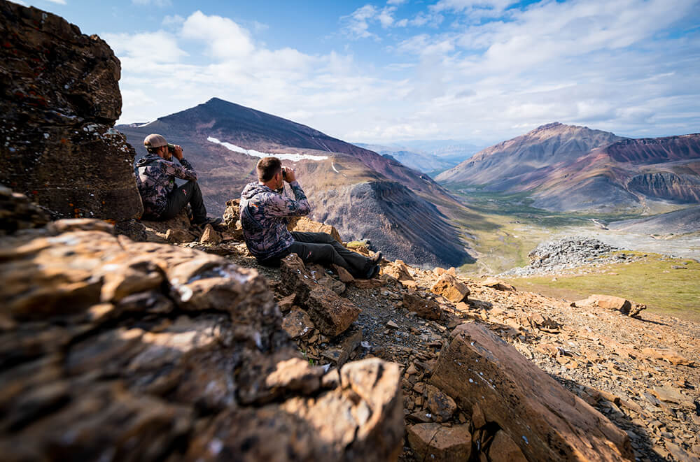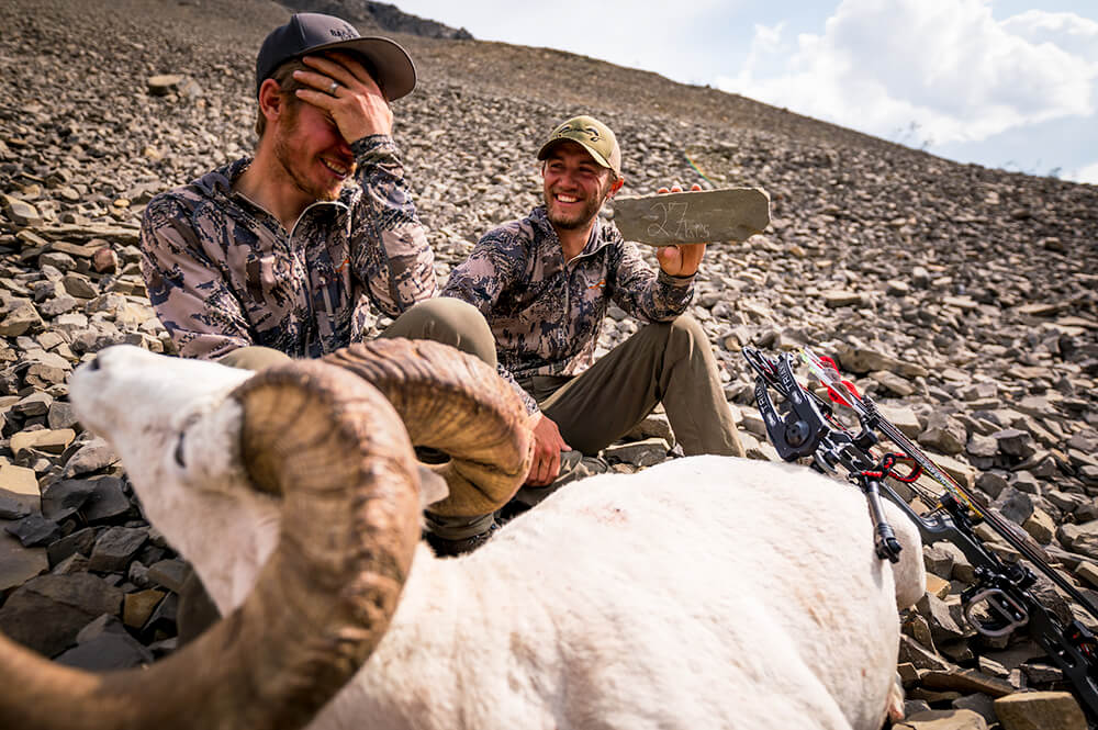 Dustin, his client Chris Peccia, fellow guide Kash Mair and SITKA photographer Steven Drake took flight deep into the McKenzie Mountains, eventually making basecamp alongside a remote lake in the crook of an ominous and impressive valley. The plan was for Dustin to guide Chris on a rifle hunt and, time permitting, they would stay out for Dustin to try and fill his own gifted tag with his bow. Now, standing beside the lake, witnessing this wide-open country of scree slopes and short grass parks firsthand, he realized, “this place is not conducive to bow hunting.”
