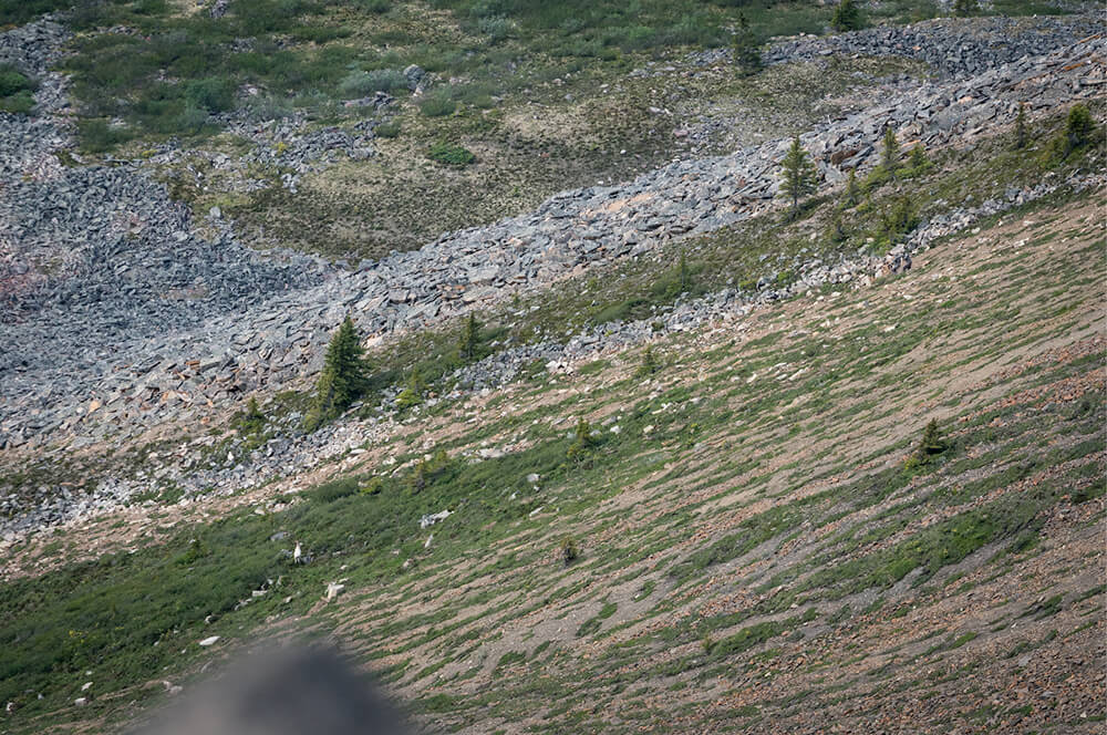 An old solo sheep, broomed-off on one side, laying in the wide-open slope, rested a mile away. “There were a few little green bushes on the scree slope and one green spot on an adjacent hill,” Roe remembers. “When he gets hungry, that’s where he’s going to go,” Roe thought. The waiting game began.