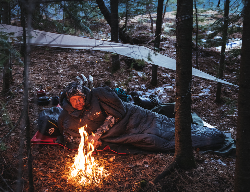 During these solo trips, Timo makes camp in much the same way he did as a smokejumper—ultra-minimalist. He carries a knife, a tin cup for warming coffee by the fire, a small tarp called a hooch, and the clothing and sleeping bag to keep him warm. During deer season, he typically paddles his aluminum canoe, which is better at breaking ice than his Kevlar boat. Packing light leaves room to paddle out anything he harvests.